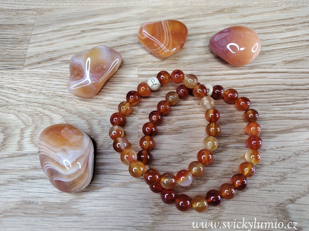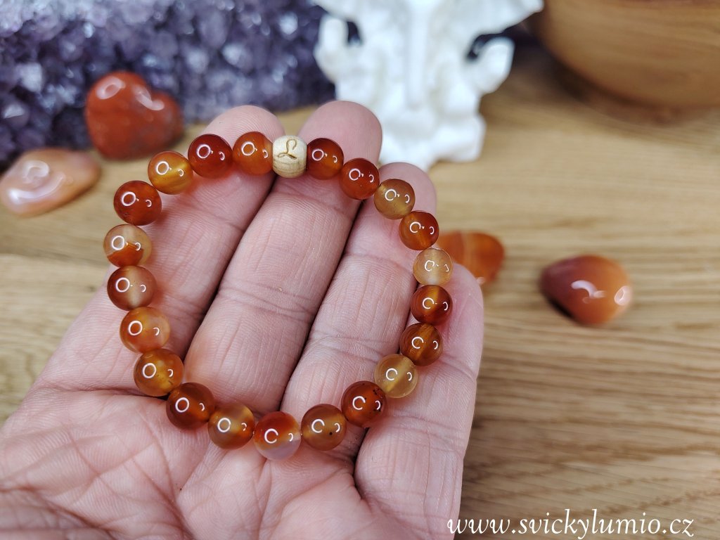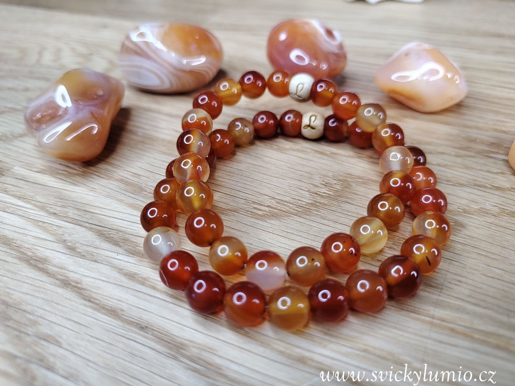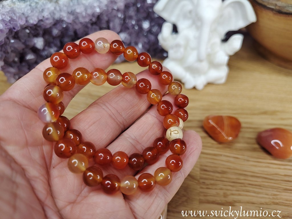 Karneol je kámen radosti a optimismu, a proto při nošení tohoto náramku mohou být podpořeny např. tyto vlastnosti: vztahy, kreativita, tvořivost, radost, positivitu, dobrou náladu, idealismus