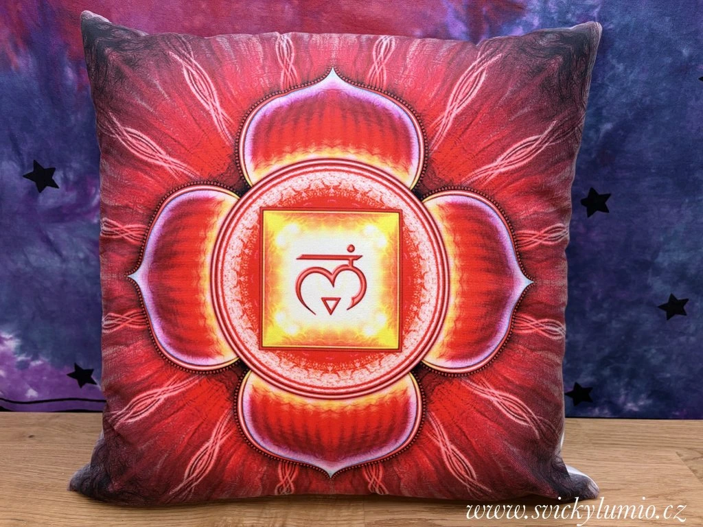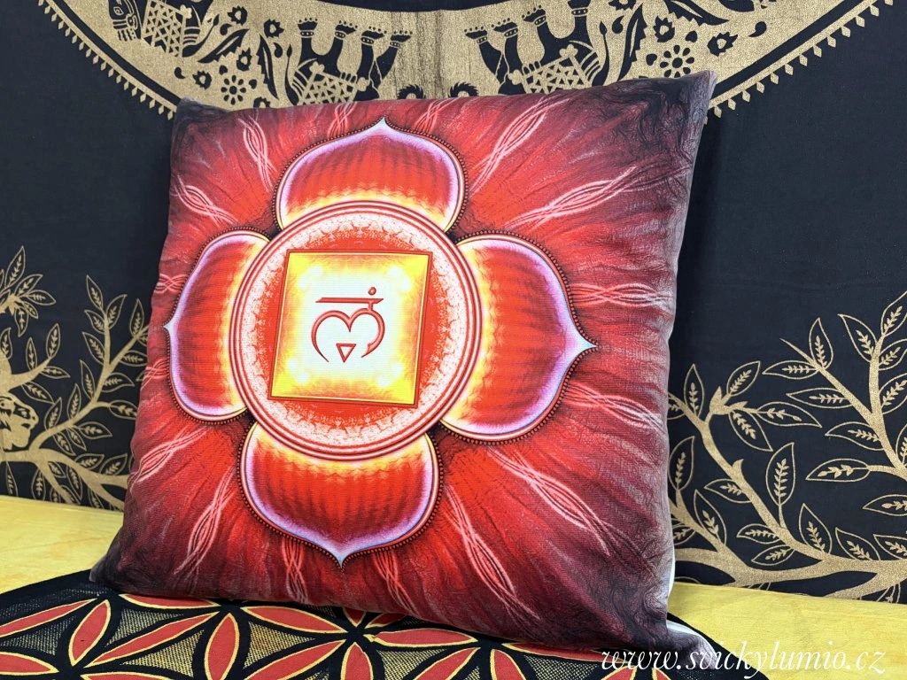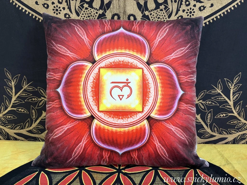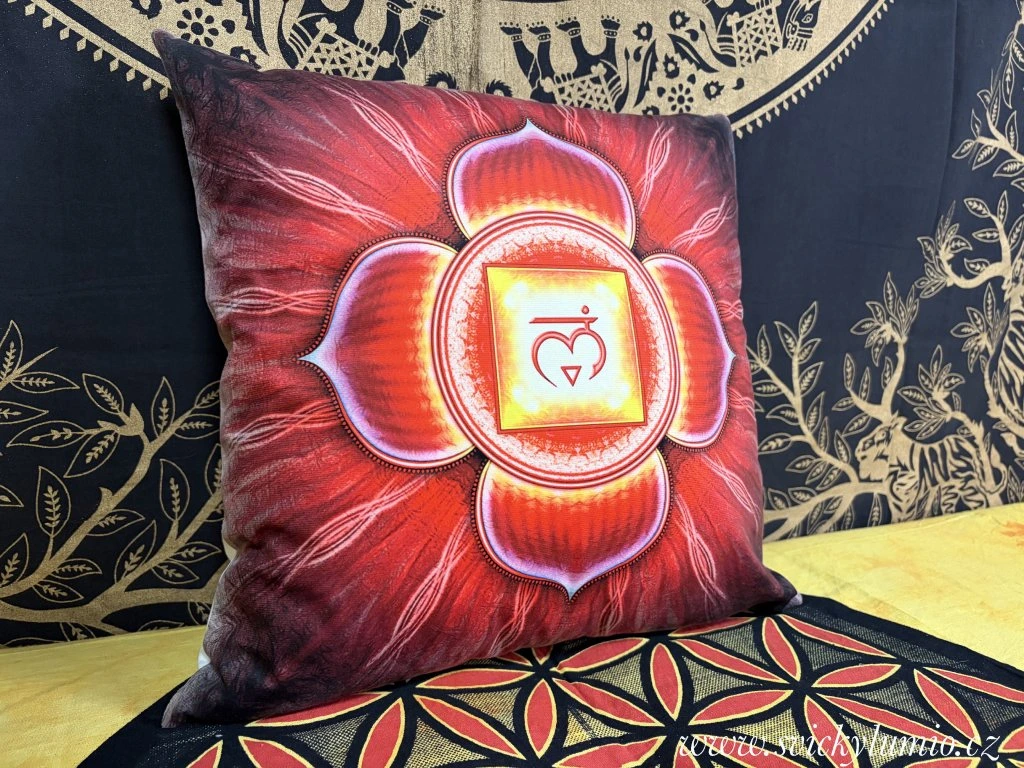 Dekorační povlak na polštář s motivem 1.ČAKRA, se postará o zpestření vašeho domova.