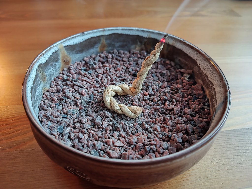 Provázek zapalte, sfoukněte a nechte doutnat na vykuřovací misce či nehořlavém podtácku.